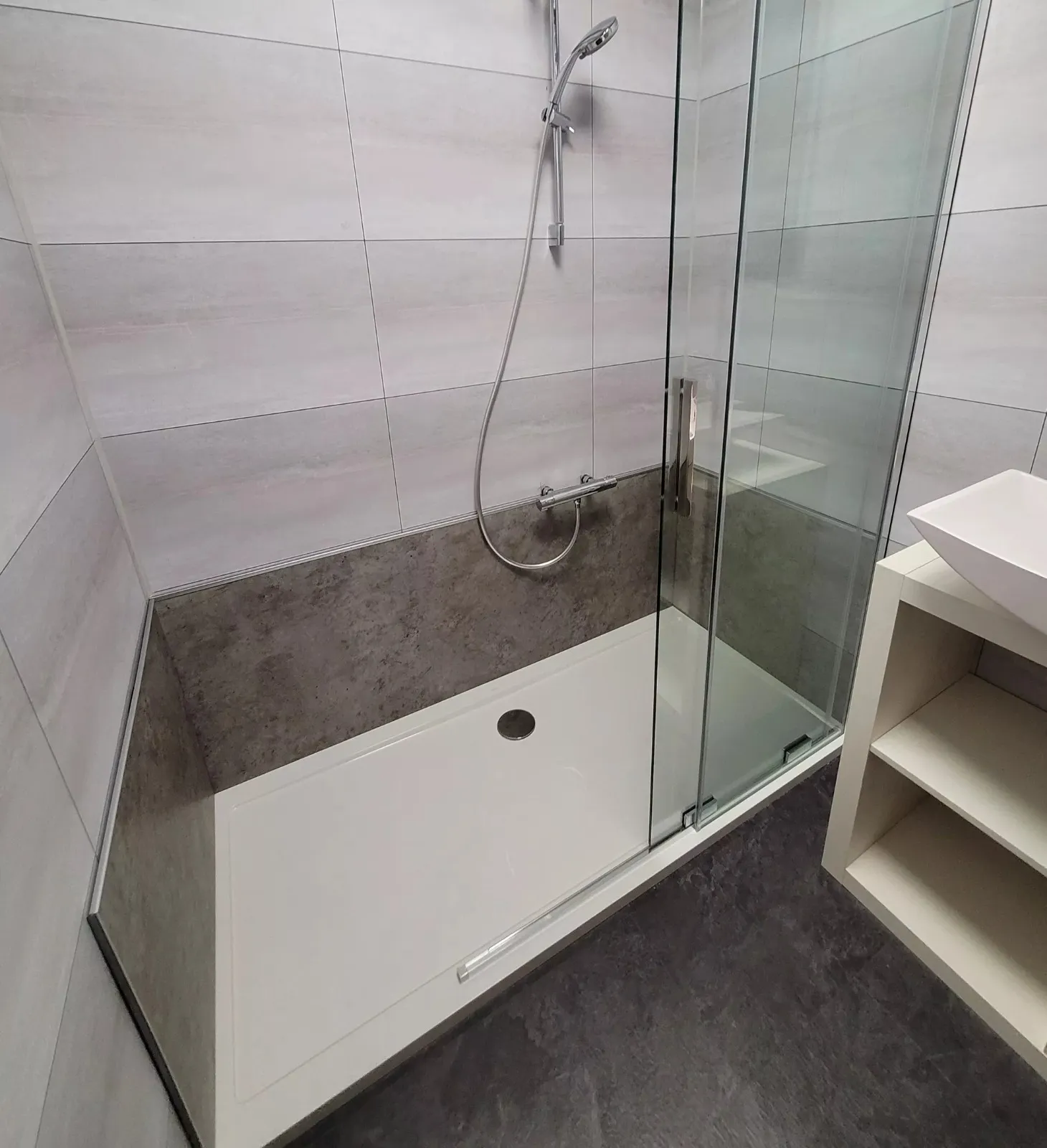 Individuelle Wandgestaltung: Den Bereich der alten Wanne gleichen wir nach Ihren Wünschen aus – entweder klassisch mit passenden Fliesen oder mit modernen, fugenlosen SPC-Wandplatten.