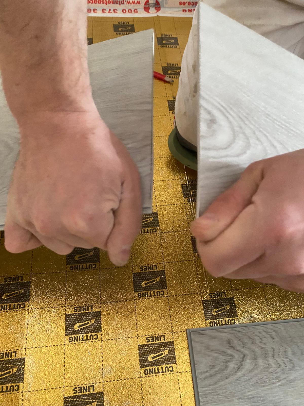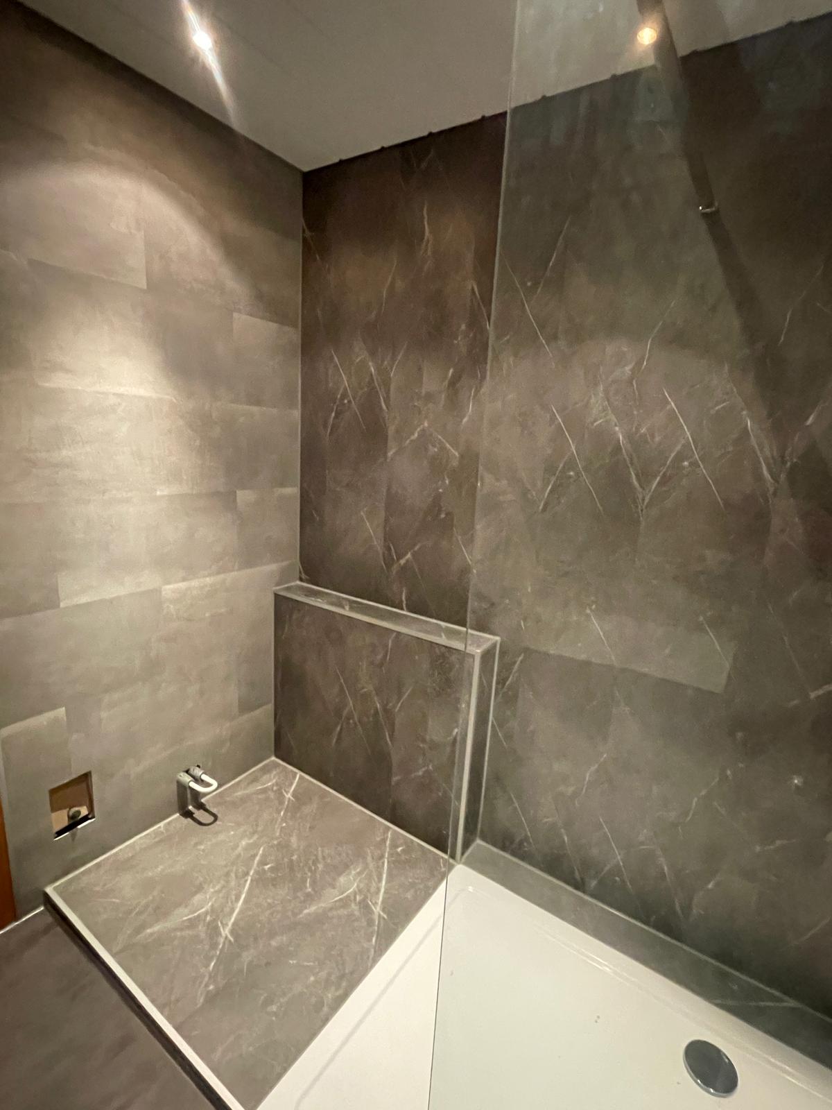 Wand & Boden: Wir verkleiden Ihre alten Fliesen mit großformatigen SPC-Platten für eine fugenlose Optik.